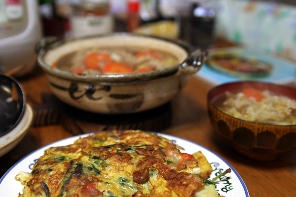 チヂミ風のニラエビタマも作ったらボリューム満点で満腹だー。