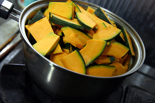 ②ひたひたになるくらいに水を加えて、マギーブイヨン投入。かぼちゃが柔らかくなるまで煮込む
