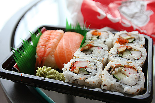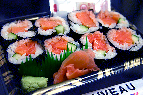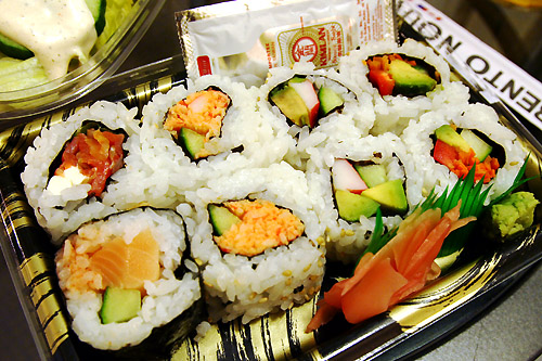 夜ゴハンは閉店間際のLOBLAWSで急いで買ったスパイシーサーモンロール。ベントーヌーボー製。