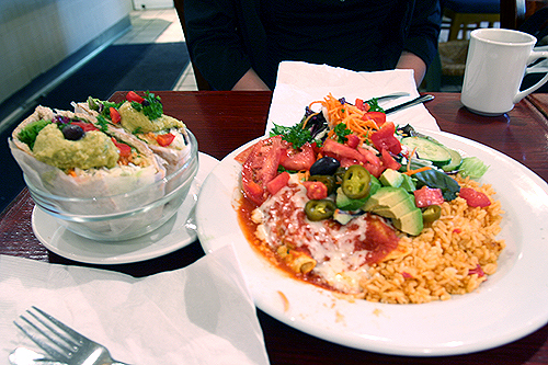 アボカド&ヒヨコ豆のピタサンド(写真左)とエンチラーダをオーダー。